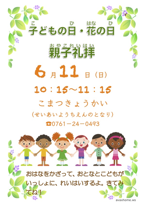 毎年6月第2週目の日曜日は、礼拝堂にお花を飾り、大人と子どもが共に礼拝します。また礼拝後には会堂に飾った花を感謝を込めて病院などに届けます。皆様のお越しをおましています。
