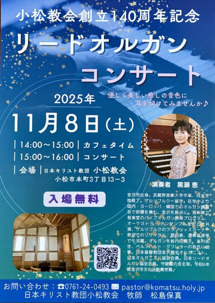 この機会にぜひこのやわらかな音色を聞いていただき、また共に賛美したいと思います。皆さまお誘い合わせの上、お越しください。